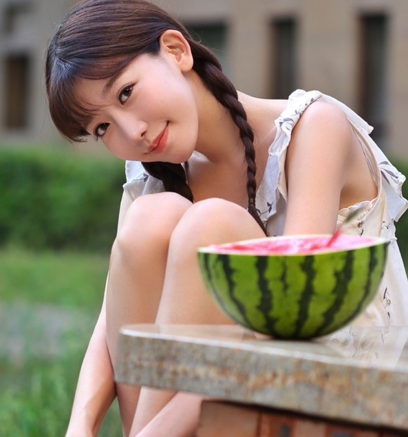 人比瓜甜!“小志玲”吃瓜降温 麻花辫清纯可人