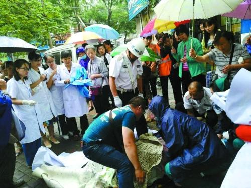 2017年6月8日,河南郑州市文化宫路上,孕妇吉女士在家人陪伴下去医院途中突然感到肚子阵痛,家人措手不及。此时,过路市民、热心商户、社区医院大夫、巡防队员等纷纷伸出援手,几十人搭起“爱心产房”。来源:河南日报