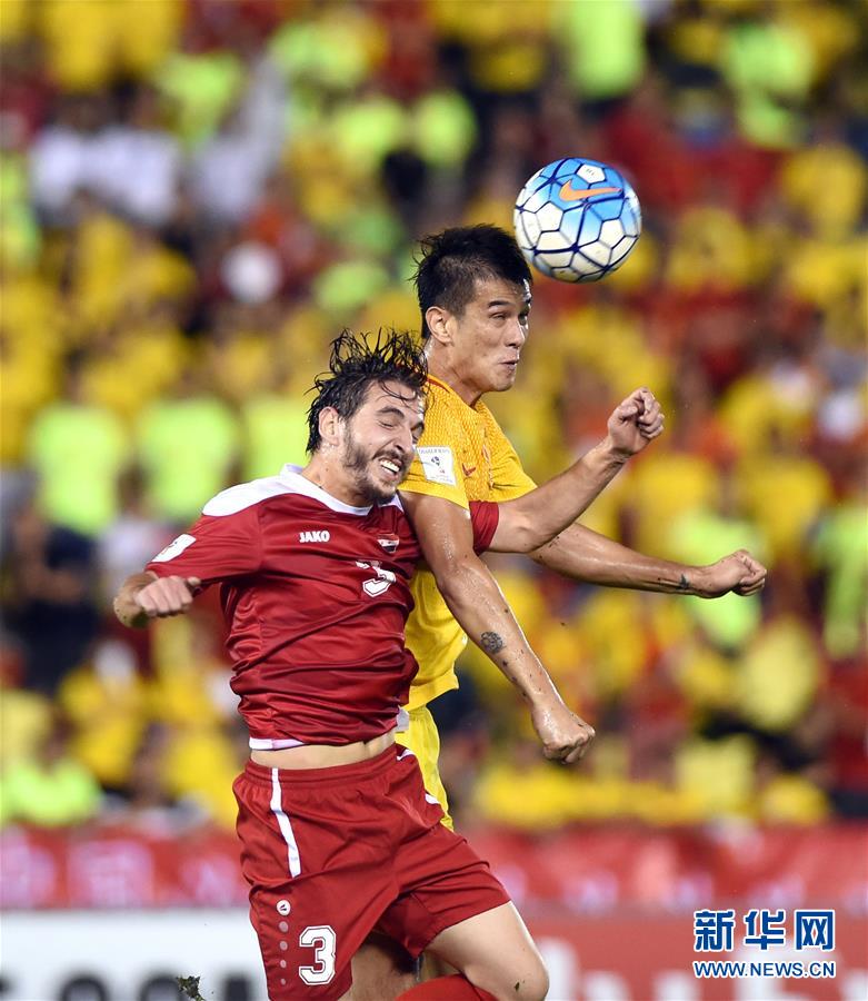 6月13日,中国队球员肖智(右)在比赛中与叙利亚队球员阿扬争顶。当日,在马来西亚马六甲进行的2018年俄罗斯世界杯亚洲区预选赛12强赛A组比赛中,中国队客场2比2战平叙利亚队。新华社记者 卢炳辉 摄