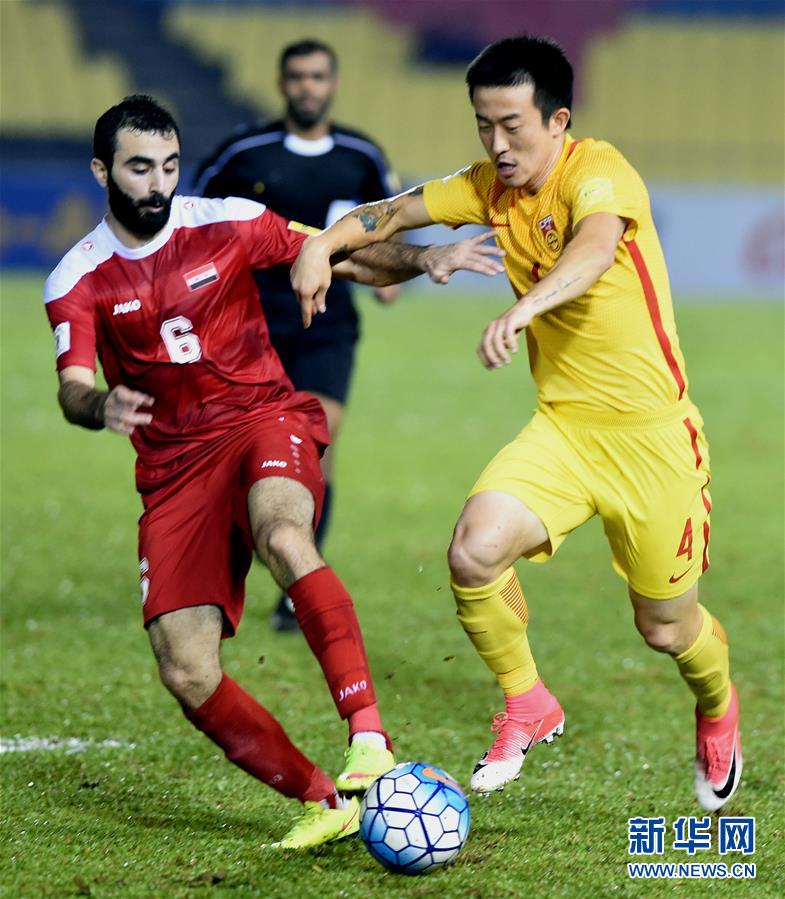 6月13日,中国队球员姜至鹏(右)在比赛中带球突破。当日,在马来西亚马六甲进行的2018年俄罗斯世界杯亚洲区预选赛12强赛A组比赛中,中国队客场以2比2战平叙利亚队。新华社记者 卢炳辉 摄