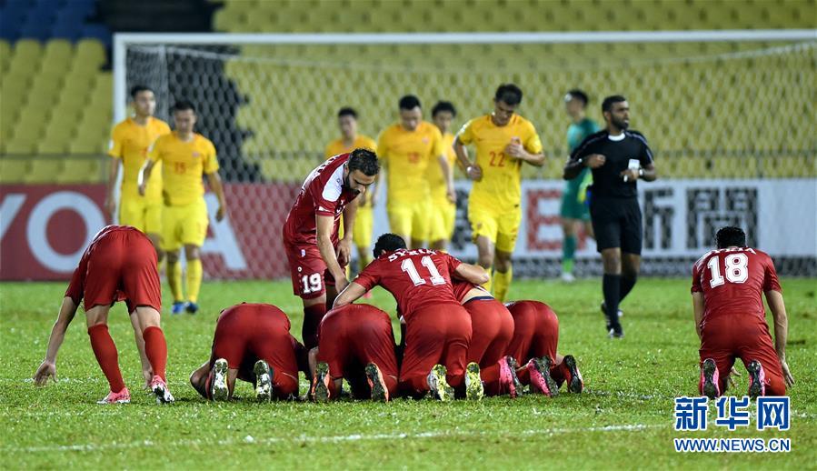 6月13日,叙利亚队球员在比赛中庆祝入球。当日,在马来西亚马六甲进行的2018年俄罗斯世界杯亚洲区预选赛12强赛A组比赛中,中国队客场以2比2战平叙利亚队。新华社记者 卢炳辉 摄