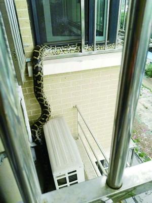当天下午5点,于女士正准备晒衣服,刚打开阳台门,只见一条大蟒蛇正盘在窗户上,朝她吐着信子。“有蛇啊!”她几乎被吓晕过去,“吓得我关上阳台门赶紧就给居委会打电话,还报了警。”于女士说。