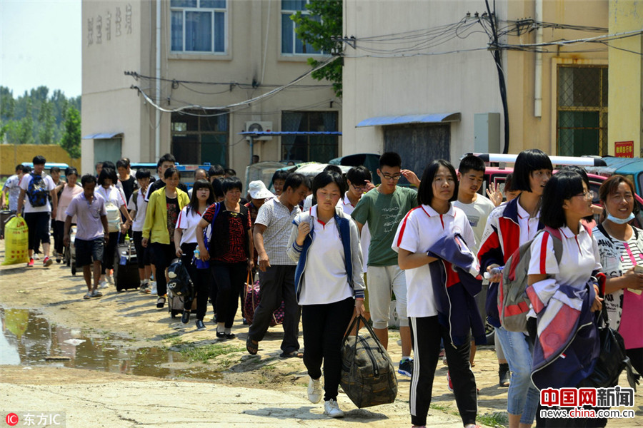 2017年6月15日, 当日,山东省茌平县贾寨中学举行简短的毕业生典礼,送学生赴中考战场。家长们也到场送行,场面感人、现场如同春运般。从15日开始,聊城市将迎来全市中学生中考,当地6万多名中学生奔赴考场参加中考。图为在山东省茌平县贾寨中学,即将奔赴中考战场的毕业生们。赵玉国/东方IC