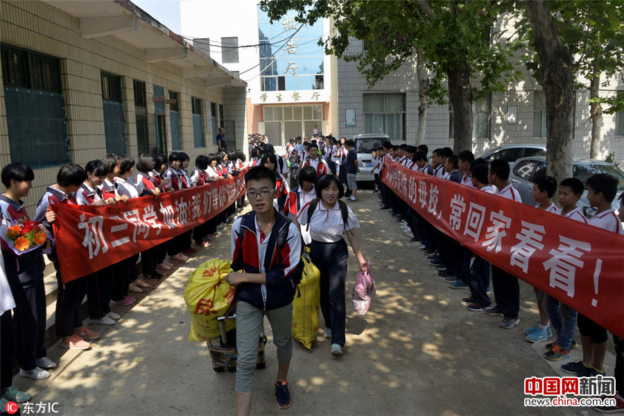2017年6月15日, 当日,山东省茌平县贾寨中学举行简短的毕业生典礼,送学生赴中考战场。家长们也到场送行,场面感人、现场如同春运般。从15日开始,聊城市将迎来全市中学生中考,当地6万多名中学生奔赴考场参加中考。图为在山东省茌平县贾寨中学,即将奔赴中考战场的毕业生们。赵玉国/东方IC