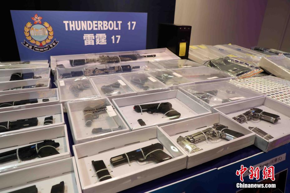 6月15日,香港警方记者会上展示“雷霆一七”的联合行动成果。为配合粤港澳三地警方一项代号“雷霆一七”的联合行动,香港警方于3月5日至6月10日期间,打击三合会及有组织罪行。行动中,香港警方拘捕3600多人,捣破多个非法赌档、卖淫场所等,同时打击高利贷集团、仿制枪械集团和跨境贩运人口集团。另外,警方在新界北捣破两个大麻种植场,涉及1600棵大麻,价值2600多万元。中新社记者 洪少葵 摄