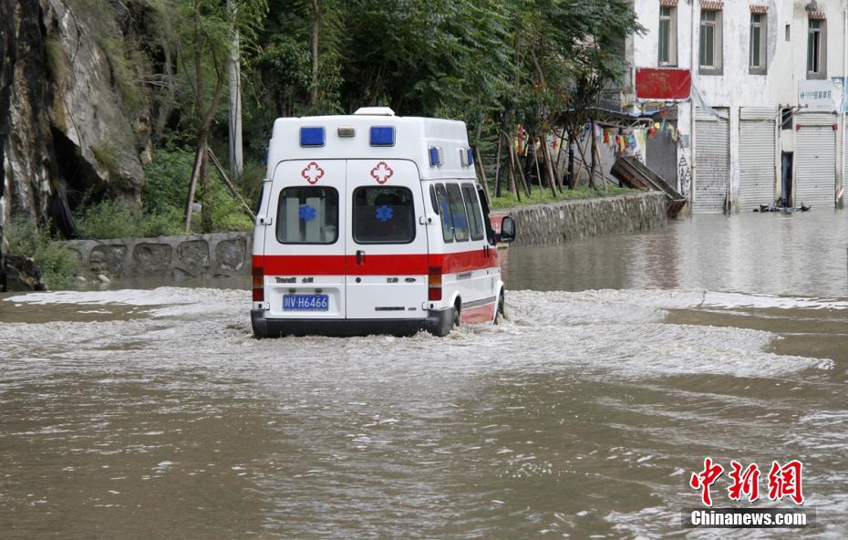 灾情发生后,丹巴县第一时间启动一级防汛响应,发布暴雨红色预警信号。公安、武警、消防、应急民兵、县级机关45岁以下男职工集结待命,国土、水务、民政等部门积极调配物资以备应急所需,各沿河乡镇加强对临河村、低洼地带、主要公路干线等重点部位的巡查力度,转移疏散人员5000余人,确保民众生命财产安全。图为一辆救护车通过被洪水淹没的道路前往现场救援。丹巴轩 摄