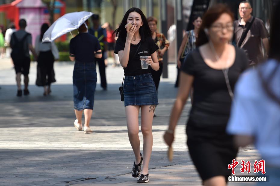 接近中午时分,若是毫无遮挡出行,让滚烫的阳光“砸”在身上,“可以感觉到慢慢被烤熟”。图为北京三里屯街头美女清凉出行。 中新网记者 金硕摄