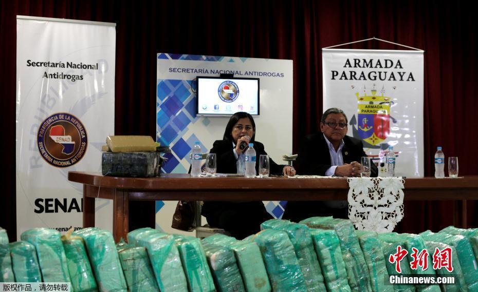 当地时间6月15日,巴拉圭亚松森,公共检察官埃尔瓦·卡塞雷斯和巴拉圭国家禁毒秘书处主任雨果·维拉上校在亚松森召开新闻发布会。在巴拉圭缉毒部队的一次行动中查获了18吨的大麻,价值900万美元。此批毒品在一艘驳船上被发现,计划被运往阿根廷和乌拉圭。
