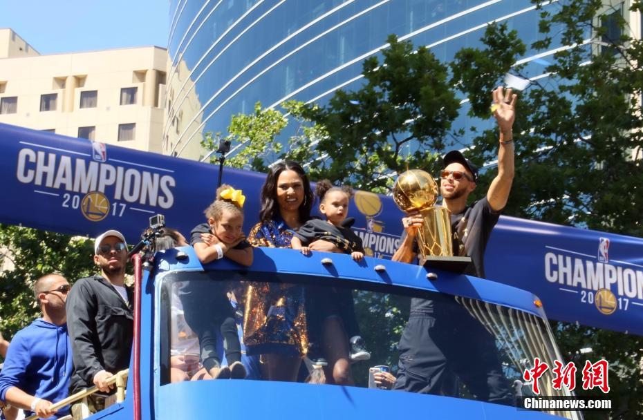 当地时间6月15日,美国奥克兰,美国职业篮球协会(NBA)勇士队后卫库里举着总冠军奖杯与妻女在庆祝花车上。当天,勇士队举行盛大游行,庆祝夺得本赛季总冠军。中新社记者刘丹 摄