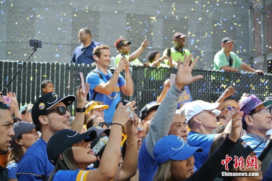 当地时间6月15日,美国奥克兰,美国职业篮球协会(NBA)勇士队举行盛大游行,庆祝夺得本赛季总冠军。中新社记者 刘丹 摄