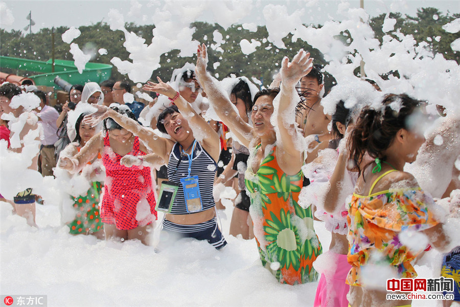 2017年6月16日,人们在山东烟台37°梦幻海水乐园“泡泡趴”活动中嬉戏。