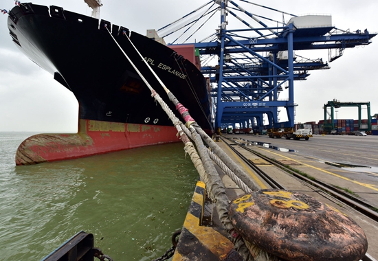 6月14日,一艘国际货轮正在广州港南沙作业区装载集装箱。摄影/章轲