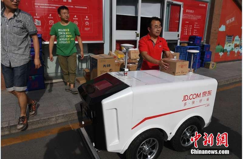 不久前,一段关于快递分拣机器人的视频在网上走红——一些装备着橙色托盘的机器人迅速穿梭,将一件件包裹运送到指定位置,完成分拣。除了机器人,无人机、无人车也投入“快递大军”中,这一系列的技术落地,预示着物流行业已经开始步入新的智能时代。在不久的将来,机器大军会参与到越来越多的行业中来,为人们生活带来便利的同时,也将给更多的行业带来升级和挑战。目前京东配送机器人已经开始在中国人民大学、清华大学、浙江大学以及西安长安大学等多所高等学府日常运营,为高校师生们送去在京东商城购买的各类商品。图为6月18日,中国人民大学京东派的快递小哥正在把包裹放入无人车中。中新网宋路易 摄