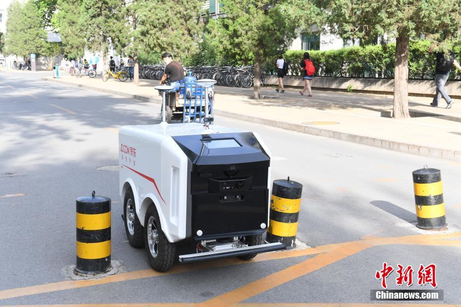 无人车遇到路障后,自主调整路径,避开路障。刚好路过的送水员正回头观看。中新网 宋路易 摄