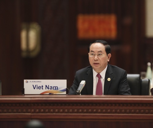 5月15日,越南国家主席陈大光在“一带一路”国际合作高峰论坛圆桌峰会上发言 新华社记者兰红光摄