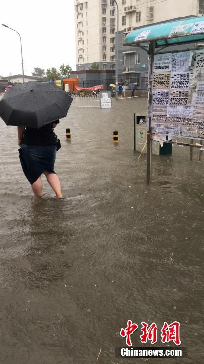 6月23日清晨,北京降雨持续,并出现了短时大雨。据北京市气象局官方微博消息,北京市气象台今日6时发布:今天白天小到中雨并伴有雷电,傍晚局地伴有短时大风或冰雹,北转东风2、3级,最高气温24℃;夜间有雷阵雨,东转北风2、3级,最低气温19℃。图为朝阳区双合家园出现积水,民众趟水出行。中新网记者 赵珊珊 摄