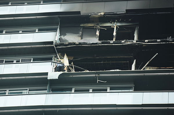 昨天清晨,钱江晚报记者第一时间赶到蓝色钱江小区,不过现场已拉起了警戒线,无法进入小区。透过围栏,看到公安和消防人员不时进出。在之江路这侧的马路上,18楼烧焦的阳台异常醒目。