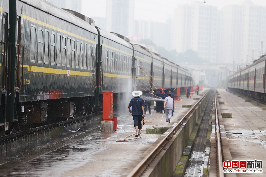 2017年06月23日,重庆,重庆北运用车间整备工对列车车辆进行清洗。
