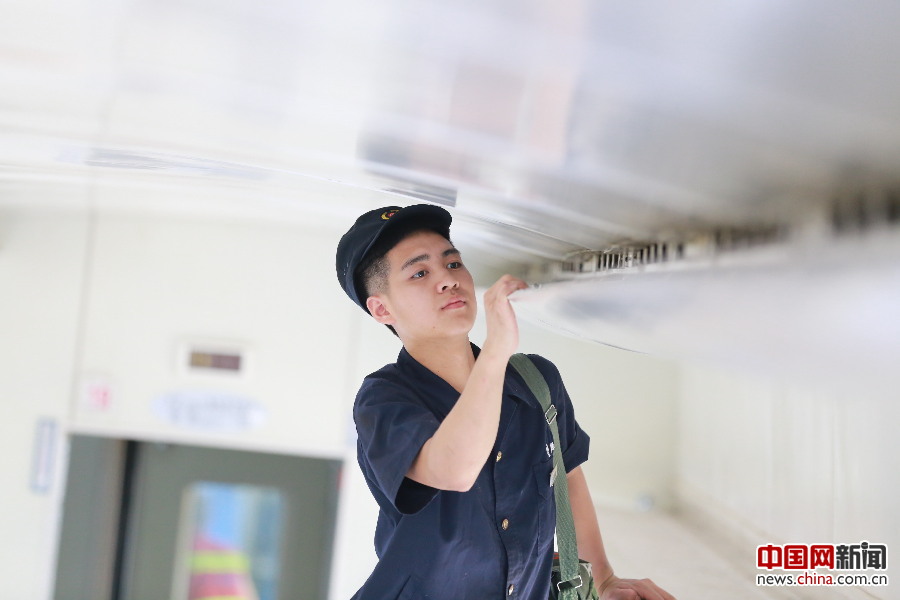 2017年06月23日,重庆,重庆北运用车间职工对行李架进行检查。