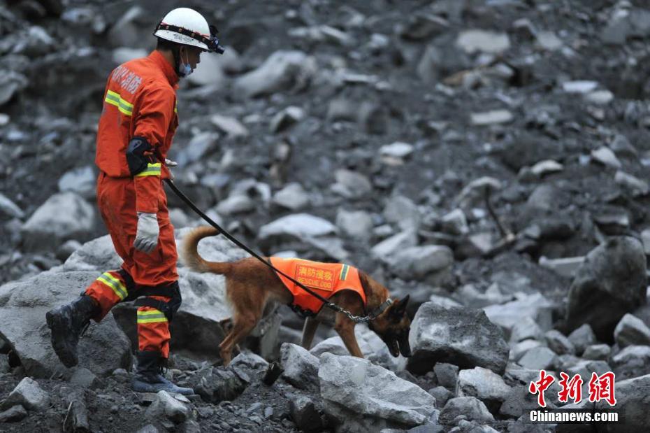 6月25日,消防人员带领搜救犬展开救援。6月24日,四川茂县叠溪镇新磨村新村组富贵山山体垮塌,大批救援人员正在现场全力展开搜救等工作。中新社记者 刘忠俊 摄