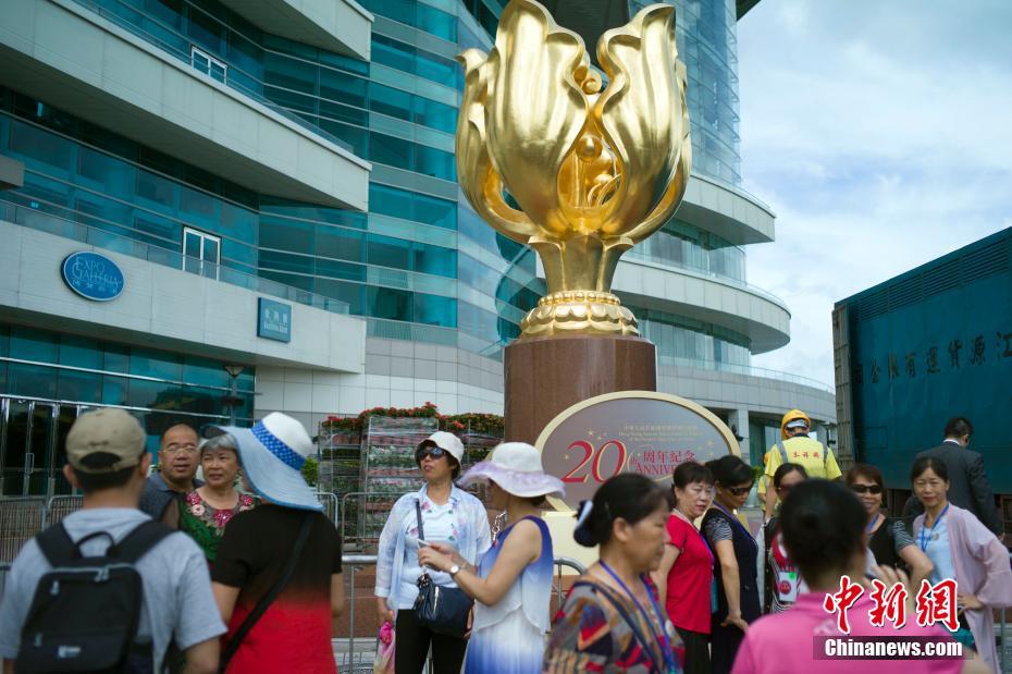 6月27日,游客参观香港金紫荆广场并留影。金紫荆广场开始布置鲜花,香港庆祝回归祖国20周年气氛渐浓。 中新社记者 盛佳鹏 摄
