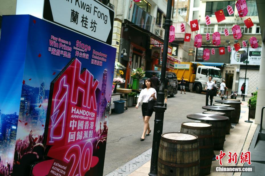 香港兰桂坊,商家张贴广告推广其香港回归20周年派对活动。 中新社记者 盛佳鹏 摄