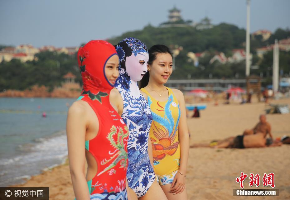 发布会请来了靓丽的模特展示新式脸基尼泳装,新款脸基尼泳装带有刺绣泳帽和青花瓷图案。图片来源:视觉中国