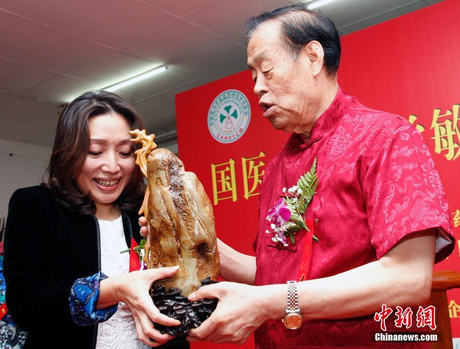 6月27日,中国工程院院士、国医大师石学敏教授,在北京中国中医科学院接受中医执业医师费翔教授拜师。图为弟子送上“老寿星”祝已是80岁高龄的师傅健康长寿。中新社记者宋吉河 摄