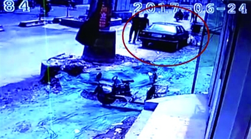 图中圈线内即为疑似打人的几名男子和其车辆(监控截图)