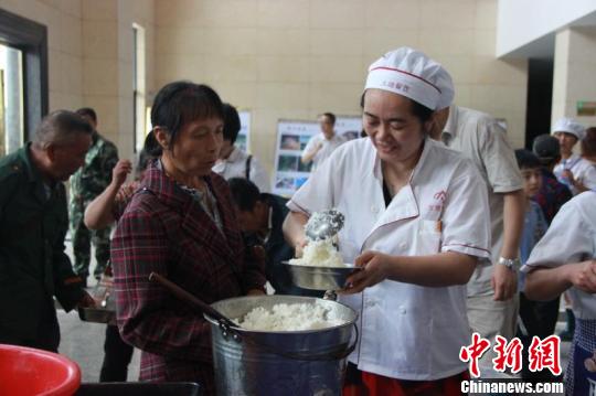 图为爱心企业工作人员为安置点受灾群众盛饭。