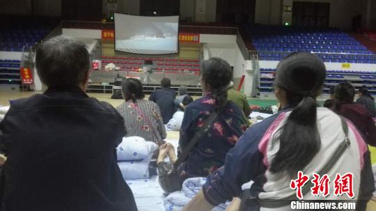 图为安置点受灾群众在看电影。