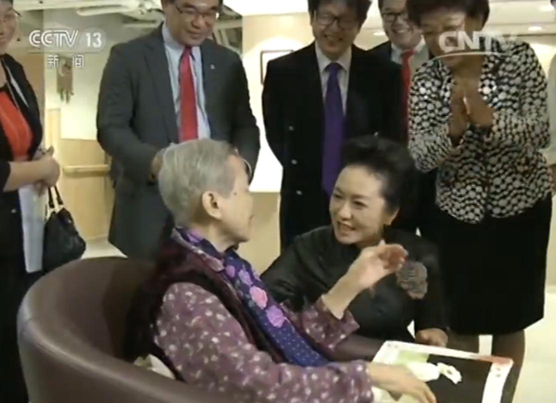 当天上午,习近平主席夫人彭丽媛,在梁振英夫人梁唐青仪陪同下,前往东华三院赛马会松朗安老综合中心参观看望。