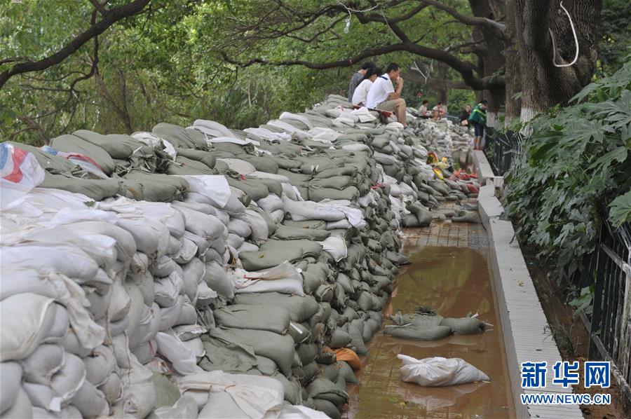 长沙城区湘江沿岸用沙袋修筑子堤抵御洪水(7月4日摄)。