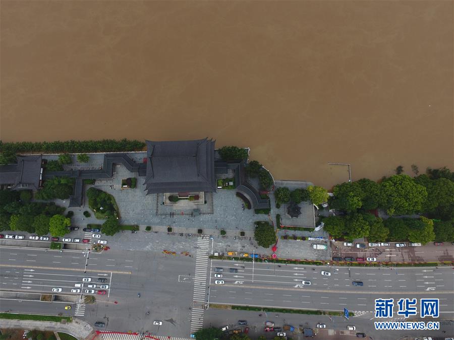 遭遇洪水侵袭的长沙杜甫江阁附近沿江风光带,周边亲水平台全部被洪水淹没(7月4日摄)。