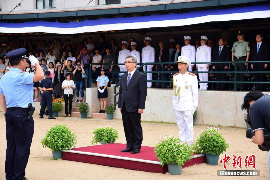 7月4日,澳门保安部队高等学校为第5届指挥及领导课程暨第24届保安学员普通培训课程举行结业礼,198名保安学员经过历时8个月的训练,完成课程并取得合格成绩,即将被调派到所属的部队工作,正式成为警界“新扎师兄”。图为受阅队伍指挥官向保安司司长黄少泽(左二)敬礼。中新社记者 龙土有 摄