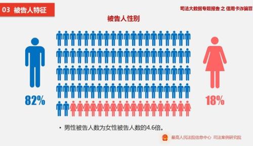 就被告人性别而言,报告显示,男性被告人数为女性被告人数的4.6倍。具体而言,男性占比82%,女性18%。