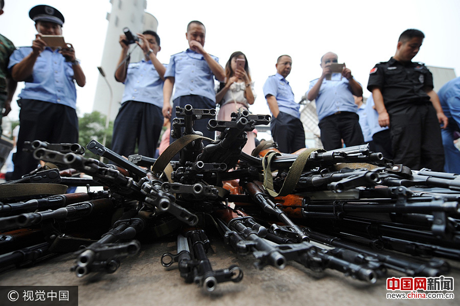 2017年7月5日,山西省太原市,太原市公安局开展统一销毁收缴枪爆物品行动,非法枪支、管制器具以及报废公务用枪共计1232件在太原钢铁集团有限公司厂区被集中销毁。Yming/视觉中国