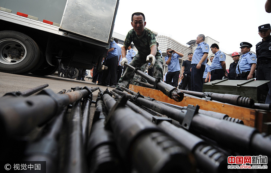 2017年7月5日,山西省太原市,太原市公安局开展统一销毁收缴枪爆物品行动,非法枪支、管制器具以及报废公务用枪共计1232件在太原钢铁集团有限公司厂区被集中销毁。Yming/视觉中国