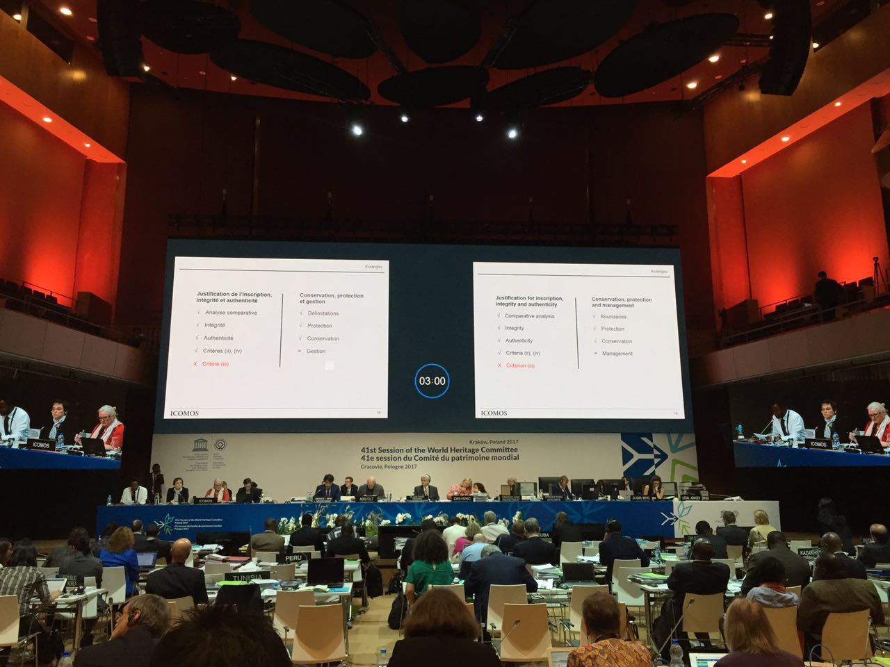 联合国教科文组织世界遗产委员会第41届会议于2017年7月2日至12日在波兰历史文化名城克拉科夫召开,共有来自107个国家和167个国际组织的1600余名代表参加会议。波兰国际文化中心主任雅采克·普尔赫拉先生(Mr. Jacek Purchla)担任会议主席。本次会议共审议世界遗产申报项目35项,其中文化遗产27项,自然遗产7项,文化和自然双遗产1项。与此同时,会议还审议了18项已列入《世界遗产名录》遗产的保护状况和30项已列入《濒危世界遗产名录》遗产的保护状况,并就处于战火中的叙利亚文化遗产的整体保护状况议题进行了审议。