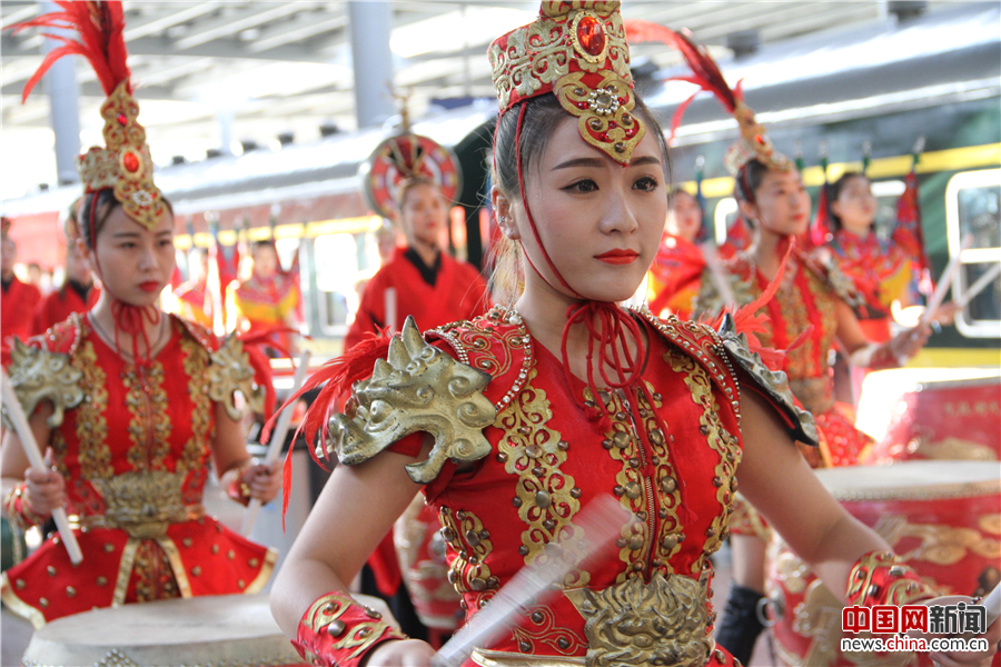 站台上的盛装女子击鼓表演。中国网记者 唐佳蕾 摄
