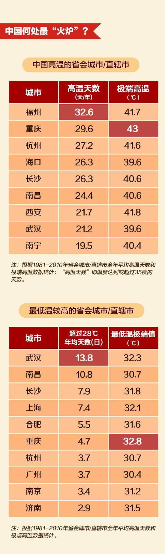 这些年来,一到夏天大家都拼命喊热,各地小伙伴也都叫苦连连。那么到底哪里最热?近日,中国气象局国家气候中心发布了一份关于中国夏季炎热城市情况的榜单。其中,排在前四位的 重庆、福州、杭州、南昌四个城市被不少网友称为“新四大火炉”。不过,近30年的历史统计数据告诉我们,这几个“新火炉”其实早就“榜上有名”了。