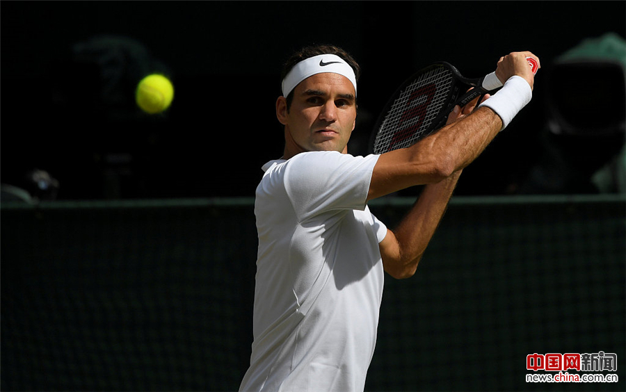 2017年7月12日,英国伦敦,2017温布尔顿网球公开赛男单1/4决赛,费德勒3-0拉奥尼奇。赛会3号种子费德勒在自己第100场温网比赛中直落三盘以6-4、6-2和7-6(4)击败6号种子加拿大名将拉奥尼奇,连续四年进四强。视觉中国