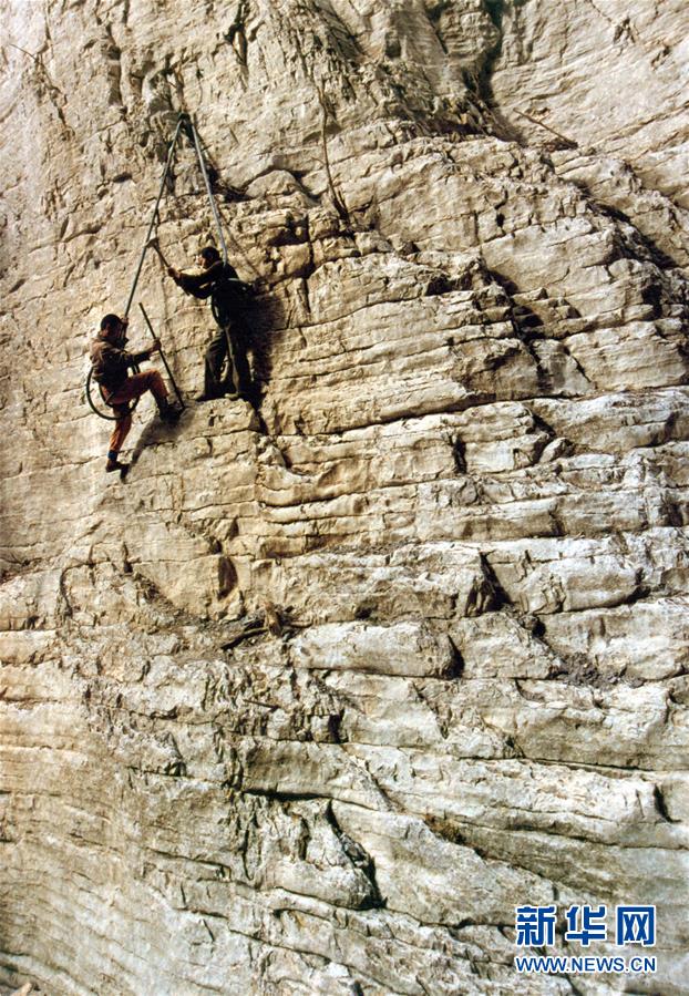 参与修路的下庄村村民在悬崖峭壁上打炮眼(资料照片)。新华社发