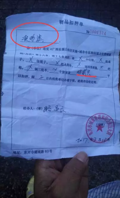 城管给李先生老婆的物品扣押单