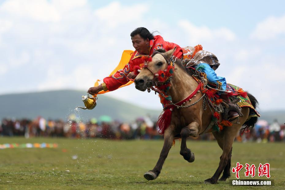 7月16日,青海省玉树藏族自治州嘉塘草原迎来一年一度的草原盛会,当地康巴男儿策马扬鞭,马背展现高超骑艺。图为马上洒甘露展示。中新社记者 罗云鹏 摄