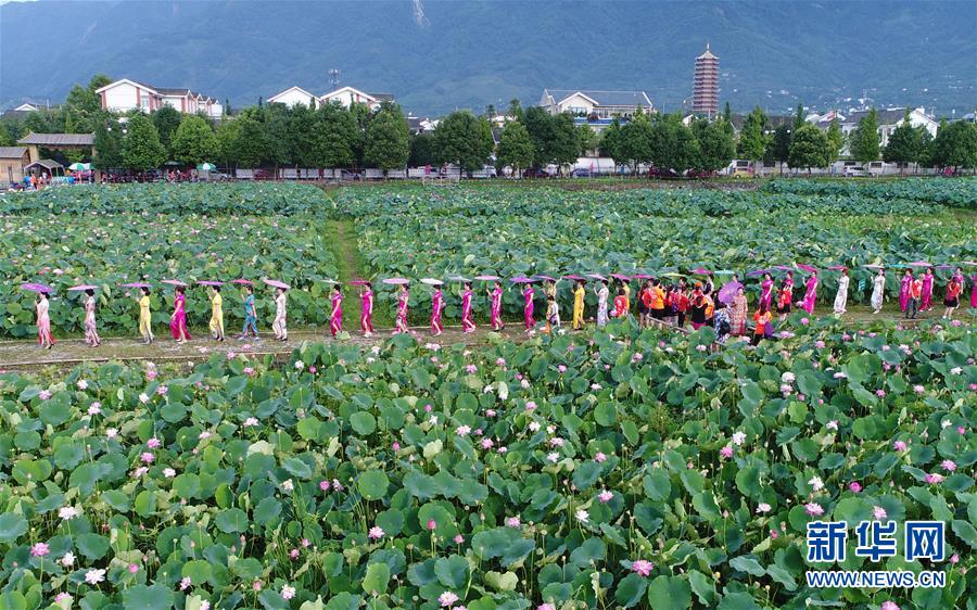 7月16日,旗袍爱好者在四川省绵竹市九龙镇新龙村荷塘参加旗袍走秀。