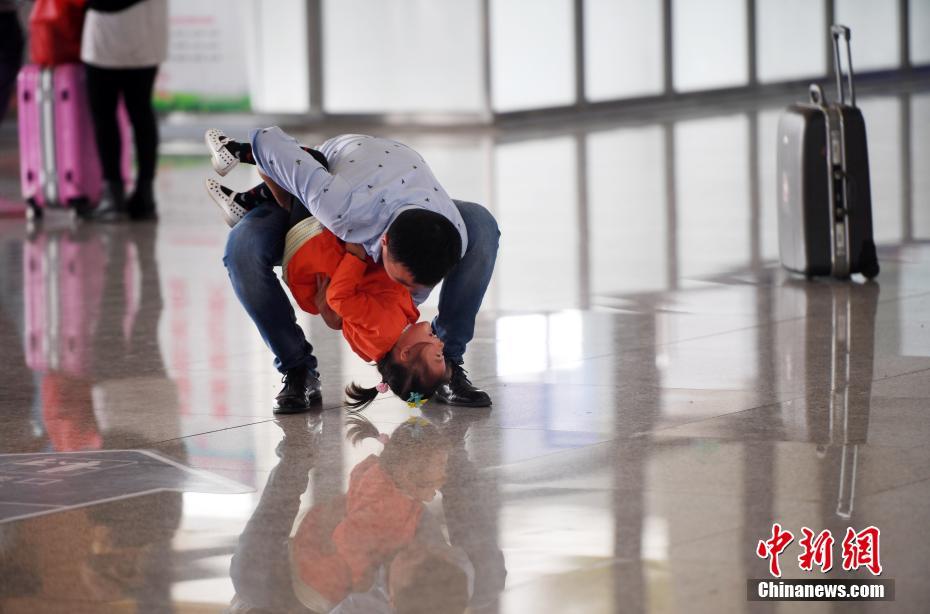 7月17日,昆明南站候车大厅里在玩耍的父女俩。当日,受持续降雨贵州境内影响,导致今天昆明经沪昆高铁前往北京、上海、长沙、南京、武汉、贵阳等方向37趟动车全部停运。同时,上述方向到达昆明南列车也将受到影响,昆明铁路局昆明南站已启动应急预案,增开9个退改签窗口,引导旅客办理改签、退票手续,通过车站广播、LED显示屏向旅客公布列车停运信息,以及换乘其它交通工具的途径和时间,并组织人员开展旅客引导和换乘咨询服务。中新社记者李进红 摄