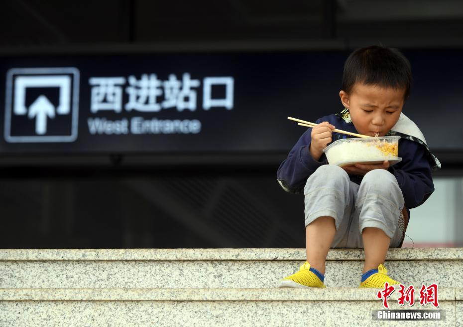 7月17日,昆明南站候车大厅外在吃食物的小朋友。当日,受持续降雨贵州境内影响,导致今天昆明经沪昆高铁前往北京、上海、长沙、南京、武汉、贵阳等方向37趟动车全部停运。同时,上述方向到达昆明南列车也将受到影响,昆明铁路局昆明南站已启动应急预案,增开9个退改签窗口,引导旅客办理改签、退票手续,通过车站广播、LED显示屏向旅客公布列车停运信息,以及换乘其它交通工具的途径和时间,并组织人员开展旅客引导和换乘咨询服务。中新社记者李进红 摄