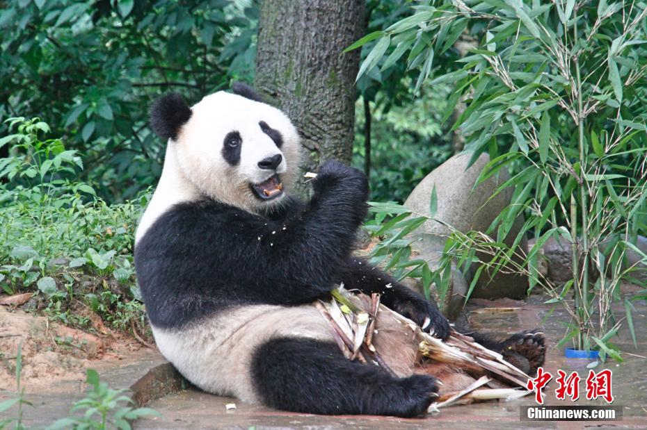 7月19日,两岸记者四川行联合采访团探访中国大熊猫保护研究中心雅安碧峰峡基地时,大熊猫正在享用美食。据介绍,大陆赠台大熊猫“团团”“圆圆”赴台前,曾在此基地生活过。中新社记者陈小愿 摄