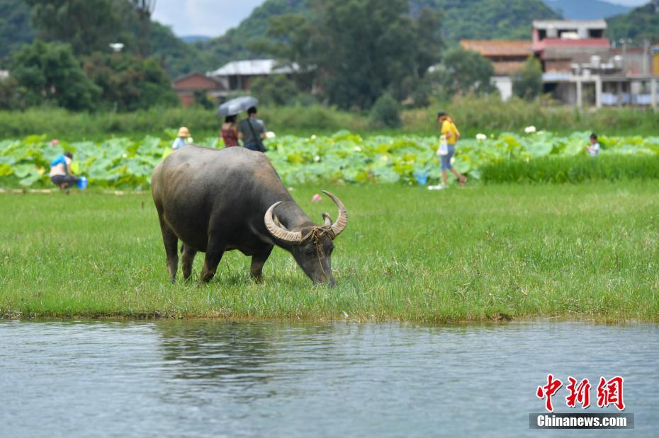 7月19日,普者黑景区内,游客与水牛共享“绿色夏日”。夏日正浓,云南丘北普者黑景区荷花逐一绽放,绿色的荷叶与清澈的湖水吸引了大批游客前来度假游玩。中新社记者任东 摄